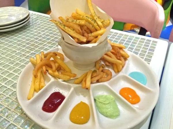 Hmm…the fries with the dip in five different colors should be interesting, but we really couldn’t wait to see the colorful cake! The menu describes it as “chemical”, and we guess that could be called an apt description of its coloring.