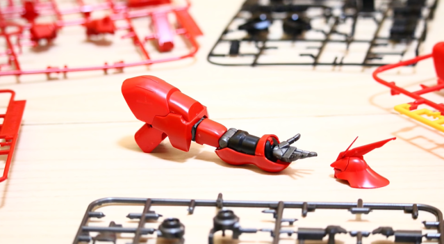 The high-speed build video is actually a series of 1,145 still photos that GeeTee took while putting the Sazabi together. The assembly and photography took him a total of 30 hours, and he spent almost as long – 20 hours – editing the photos into a flowing video and adding the robotic sound effects heard throughout.