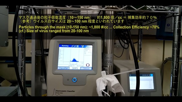 So, Okuda tried wrapping an ordinary surgical mask, like those sold in drug stores, around the top of the hose. The air that the SMPS measured now had significantly lower amounts of particles than before; somewhere around 1,800 per cubic centimeter. Okuda estimates that this means that surgical masks are able to collect about 60-70 percent of particles of that size. That means that the majority of virus particles won’t make it through the mask as you’re breathing in.