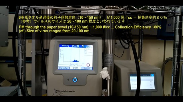 Then Okuda tried a “mask” made out of three paper towels that had been folded in half; essentially the same as six layers of paper towels that have been stacked one on top of the other. Surprisingly, the paper towels were more efficient at catching particles than the surgical masks. According to the SMPS, the air sucked through the paper towel mask had only about 1,000 particles of that size per cubic centimeter, with a collection efficiency rate of about 80 percent.