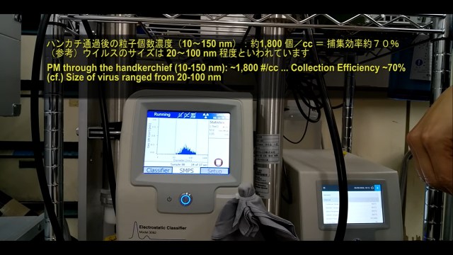 In the final experiment, Okuda used a handkerchief that had been folded over three times. When placed over the SMPS hose, it had a similar effectiveness as the surgical mask, reducing the particles in the air down to 1,800 particles per cubic centimeter. Though he doesn’t specify what kind of fabric his handkerchief was made of, we might guess that it was a more common variety of cotton or polyester, which those of us ordinary people could find easily.