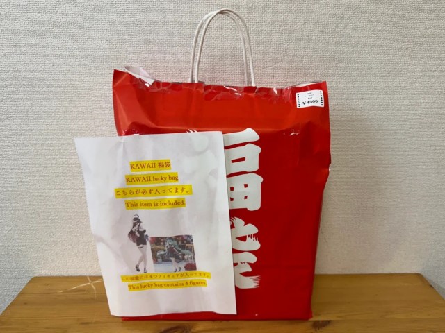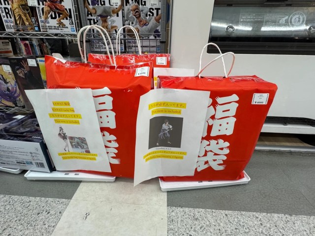The signs were attached to a few fukubukuro lucky bags outside the store, and the one Ikuna gravitated to read: “Kawaii Lucky Bag. This item is included. This lucky bag contains 4 figures“.