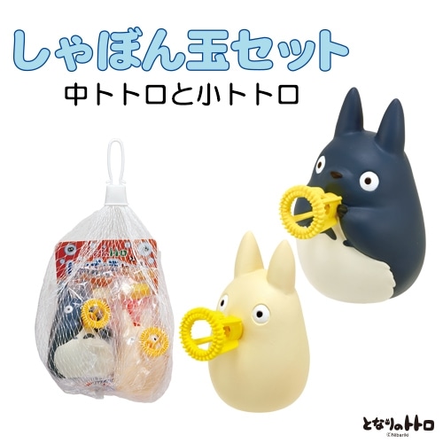The Medium and Small Totoro Soap Bubble Set comes with a tray, two bottles of soap bubble liquid, and two bubble blowers, with the smaller Totoro measuring 4 x 7 x 6.5 centimetres (1.57 x 2.76 x 2.56 inches) and the medium measuring 5 x 7.5 x 8 centimetres.