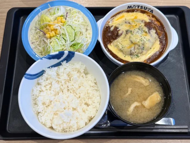 - Set Meal of Hamburg Steak in Brown Sauce Topped with Cheese (1,030 yen → 960 yen with app coupon)