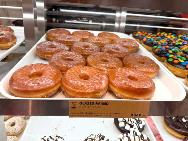 On the other side, we have the local defender of glazed donuts, Krispy Kreme’s Original Glazed (216 yen for takeout). Similarly, it’s a yeast donut with a glaze coating. The Original Glazed is such a well-known and established donut that many Japanese people, even fans of other donut brands, would say that when they’re craving glazed donuts specifically they head to Krispy Kreme. Like the Glazed Raised, the Original Glazed is also Krispy Kreme’s best-selling and signature item.
