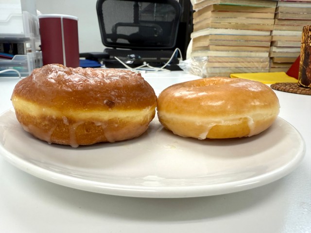 To make this showdown fair, we rounded up three donut connoisseurs from our office —also known as whomever happened to be nearby and was feeling slightly peckish— and put the two donuts side-by-side.