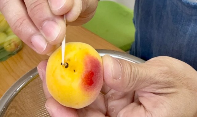 The first thing to do is to remove the stems from each of the plums. This is where the toothpick will come in handy, since it’ll allow you to dig the stem out without slicing up the rest of the fruit.