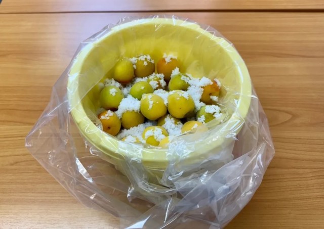 We’re also going to need a container to keep the plums in as they pickle. While you could possibly get away with any old bucket, Go recommends getting a specialized pickling bucket, which has two lids. Amazon Japan has a bunch here, with several available for about 1,000 yen (US$7]. He suggests getting a “pickling stone” too, which is a fancy name for a weight designed to sit on top of the pickling bucket’s inner lid and keep it firmly clamped down. Again, you could probably use any suitably disc-shaped heavy object, but you can get a pickling stone from Amazon Japan for 2,000 yen or less, so Go thinks it’s a worthwhile investment. And last, Go strongly recommends getting a pickling bag that can be tied up to protect the plums during the process, and once again, you can get them from Amazon Japan, with Go’s preferred brand being about 500 yen for a set of two bags.