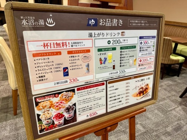 If you’re of the mindset that a nice cold beer is the perfect after-onsen beverage, you can also upgrade to a glass of Suntory Premium Malt’s for an additional 200 yen, or a cocktail if you prefer. Surprisingly, the lounge also serves Coldstone ice cream (something that’s getting harder to find in Japan these days) and savory snacks such as edamame and takoyaki.