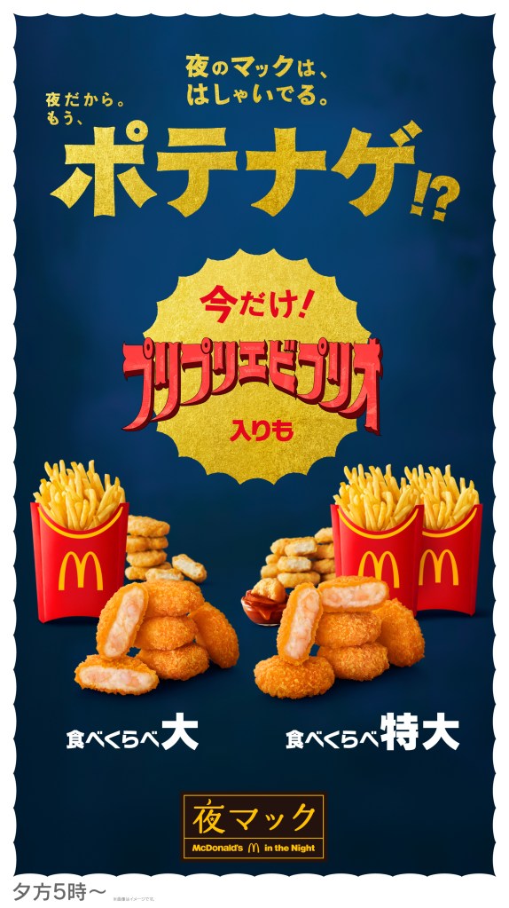 For a limited time, these nuggets of shrimp meat breaded and seasoned with salt, pepper, and garlic will be sold in packs of five for 290 yen (US$2). They can also be bought as a part of McDonald’s popular late night Poté-Nagé combos that add a large order of fries and a five-pack of Chicken McNuggets, so you can sample and compare all of the sides at once.
