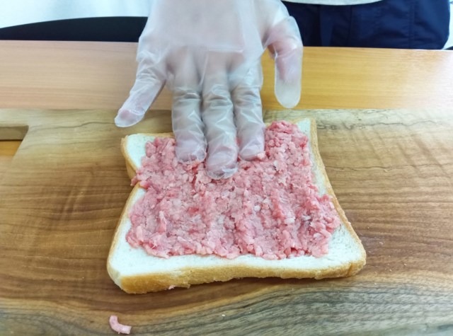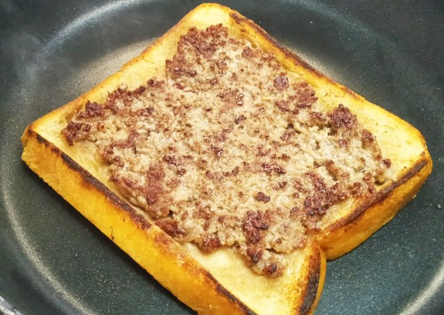 The slice of bread was next placed meat-down in a frying pan.