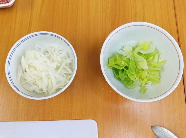 First, our hungry writer opened the Onion and Lettuce Mixed Salad, and unmixed it by separating the onion and lettuce into their own bowls.