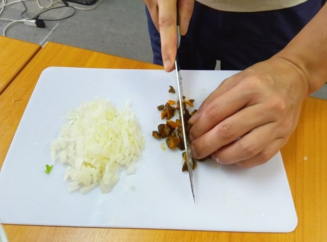 He then got the pickled cucumber and diced it up too.