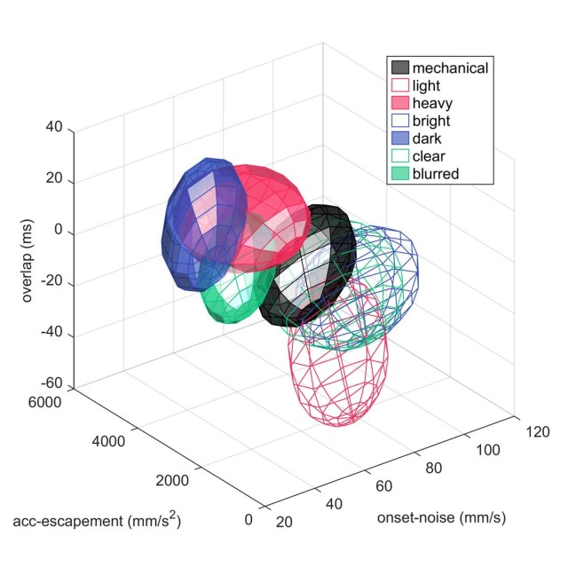 In this graph, the “overlap” axis shows how far different notes played by different fingers or hands either overlap, with a positive value in milliseconds, or are separated, with a negative value in milliseconds. The acc-escapement is the acceleration the key is undergoing at the moment the hammer is released, and the onset-noise is the initial speed of the key. The combination of these three values will make the hammer escape in a very slightly different way and create a sound in the corresponding timbre zone.