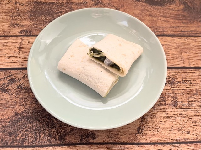 Just like 7-Eleven’s other burritos, this one is meant to be heated before eating, so that’s what we did, popping it into the microwave for 50 seconds at 500 watts before slicing it in two for a look at the cross section.