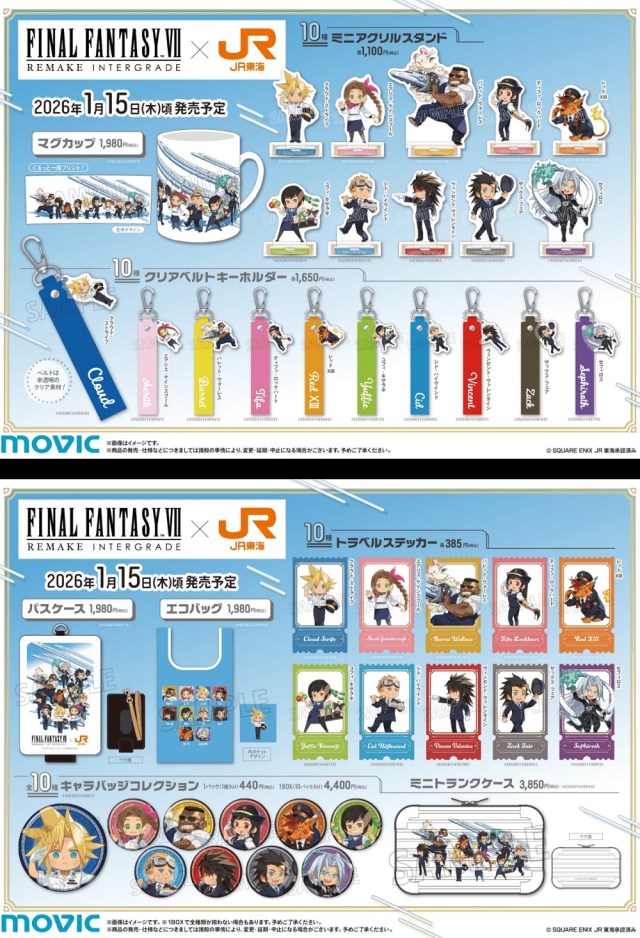 Those illustrations will be featured on a whole slew of other items, too, as a Final Fantasy VII Shinkansen merch line will be on offer at Animate Nagoya and the Nagoya City Science Museum starting January 15, with coffee cups, acrylic mini character standees, keyholders, reusable eco shopping bags, rail pass cases, stickers, pins, and a “mini trunk case” (a rectangular zippered case) to choose from.