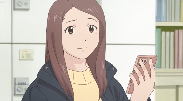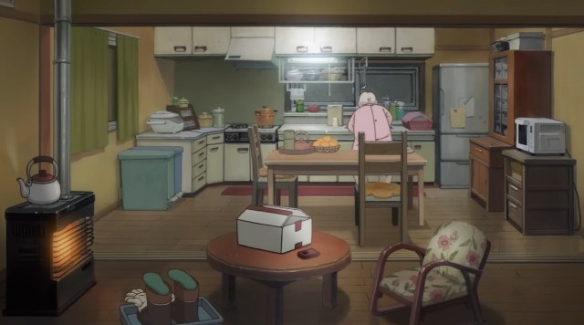The short is full of little visual details like the kettle that Grannie keeps on top of her living room space heater, an old-school way of adding a little extra heat and humidity to home interiors in Japan. She also sets her boots and gloves in a tray and places them in front of the heater, rather than leave them in her entryway, so that the slush they’ve picked up while she was outside don’t harden into ice, and also so that the melted snow doesn’t get on her floor. Then there are the subtle indicators of the gap in age between Mai and her grandma. While Mai whips out her smartphone to send messages, Grannie is still rocking a flip phone, or “garakei,” as they’re called in Japanese. Then there’s the stool Grannie has in her entryway to help her get her shoes on and off without having to put extra strain on her nearly century-old knees and back.