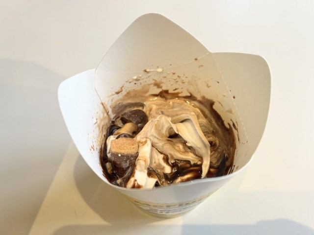 According to McDonald’s, the two famous cookies aren’t the only things you’ll find inside this new McFlurry, as it also contains a smooth soft serve ice cream base, and two different types of chocolate sauce. Peering into the battlefield, the mushroom and bamboo shoot cookies were still intact, which was a surprise as we were sure they would’ve been chopped up during the blending process.