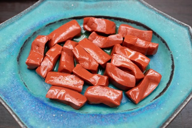 Then came the Flavored Red Konjac. The deep red coloring of this snack is achieved by ferric oxide, which you might recognize by its more common name of “rust.” While that might sound strange, it’s actually a very common food coloring used in lots of candies, baked goods, pet foods, and more to provide brownish, yellowish, and reddish tinges as needed. It’s not like they scrape it off a hubcap or anything, either. It’s made under very sanitary conditions.