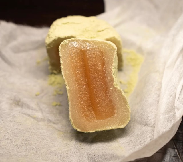 They have a coating of wasanbon sugar, which has a consistency somewhere between icing sugar and the kind you might put in your coffee.