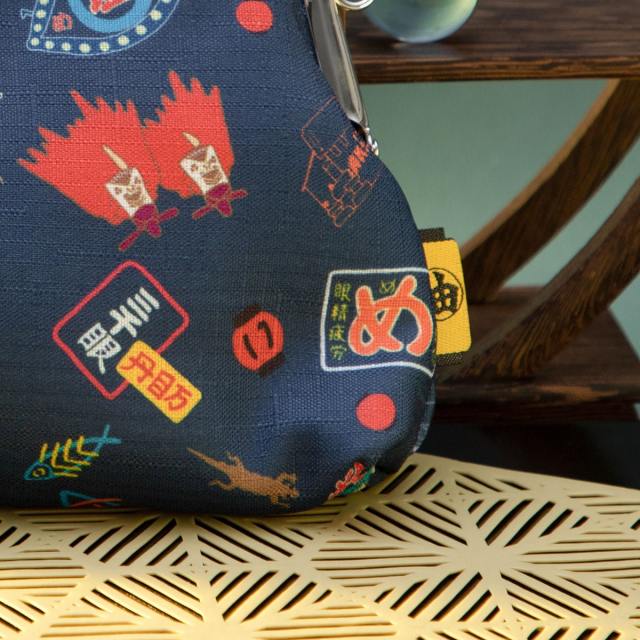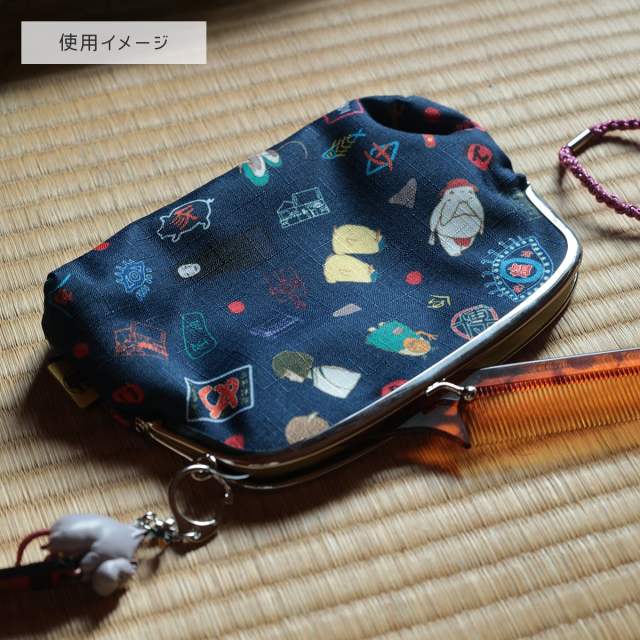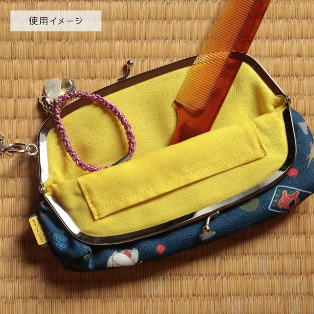 Measuring 22 ×14 centimetres, this pouch has a wide opening (“gamaguchi” literally means “toad’s mouth”), making it easy to store and retrieve items like makeup and small accessories.