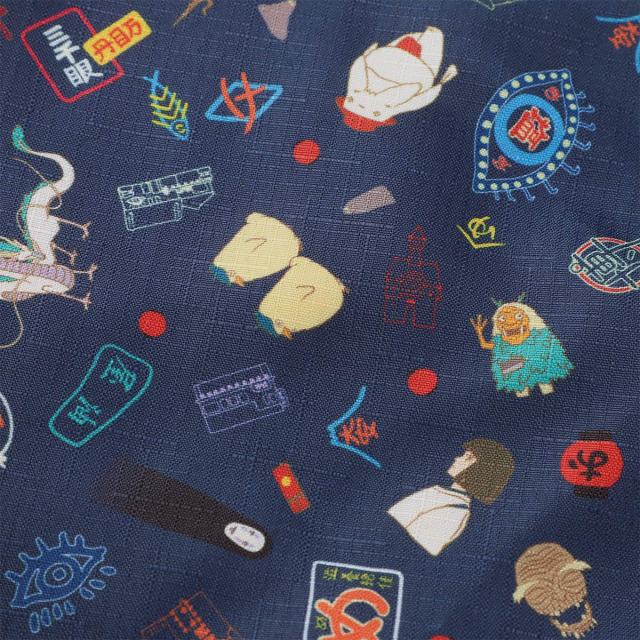 The pattern is filled with images from the film, laid out in a playful style that adds movement and energy to the design. The dark navy background evokes a night-time scene, where curious characters appear alongside lanterns and neon signs, inviting us to join the celebrations.