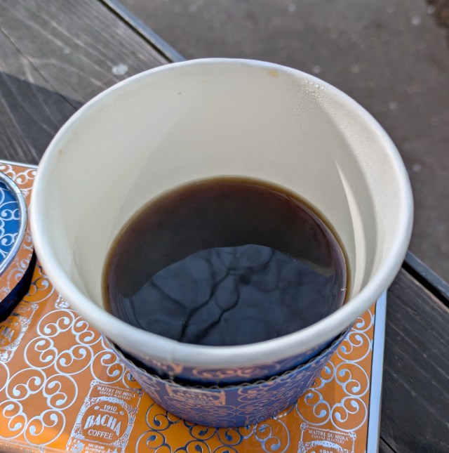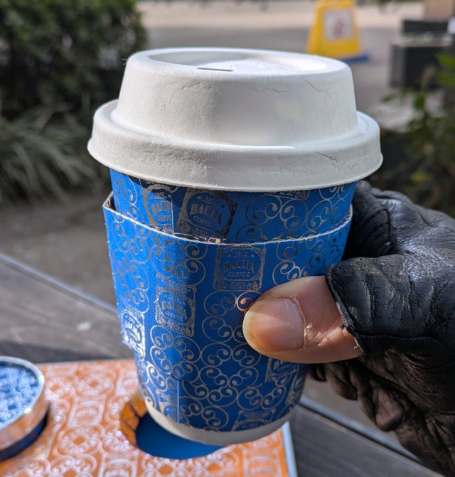 ▼ But he walked away with the coffee in a fancy paper tray.