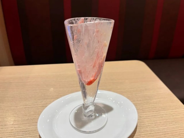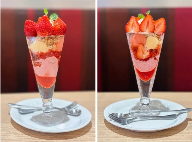 Cynics might see this as a way for Denny’s to try charging a full price for half a dessert, but the restaurant is doing right by customers regarding the price. The Split-in-Half Parfait is priced at 990 yen (US$6.40), roughly half the price of Denny’s full-sized strawberry parfaits. They’re not cheaping out on the kind of fruit here either, opting for Japan’s premium amaou variety of strawberry.