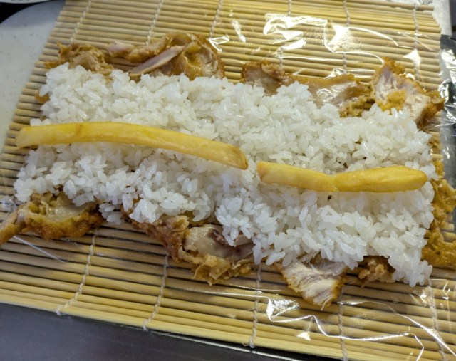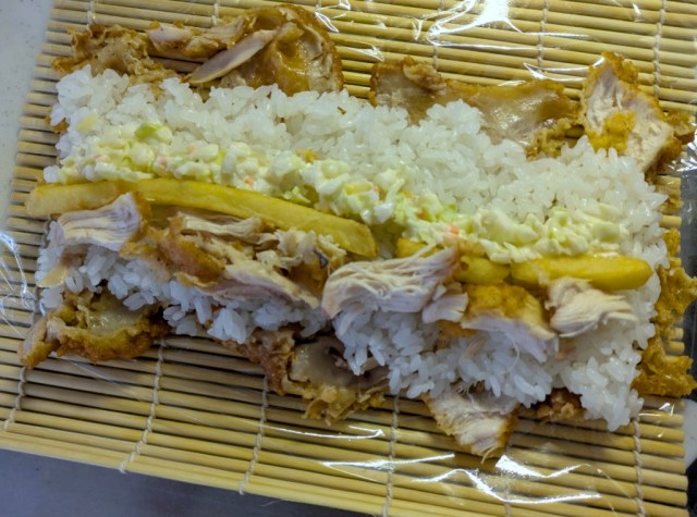 Technically, you could roll everything up here and you’d still have a sushi roll, but remember, ehomaki are supposed to have some kind of special filling inside of them too. As you might have noticed in the above photo, Mr. Sato’s KFC combo pack included sides of French fries and coleslaw…