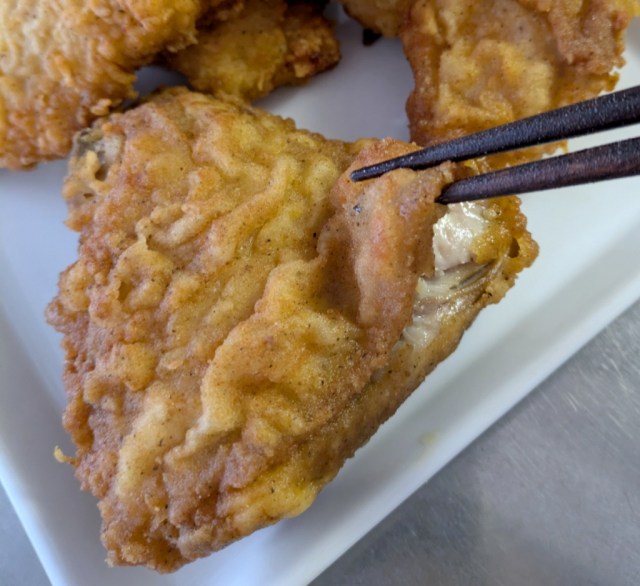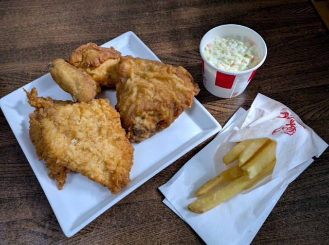The Tokutoku Pack lets you pick between Original Recipe or boneless chicken, and Mr. Sato opted for two pieces of each. This turned out to be a mistake, though, since the boneless chicken is breaded but has no skin. This left Mr. Sato with only two pieces from which to source his fried chicken skin, which, as we’ll see later on, ended up being an issue.