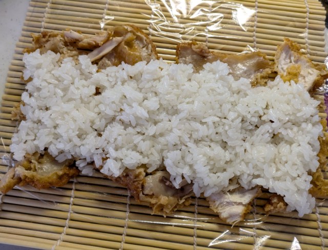 Ideally, you want the strips of skin to overlap with each other as you place them side-by-side, but unfortunately, with only two pieces of fried chicken to source skin from, Mr. Sato couldn’t always do this. In any case, though, once you’ve got the skin set, the next step is to add rice on top of it.