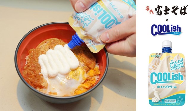 Yep, that’s a pouch of confectioner Lotte’s Coolish drinkable ice cream being squeezed onto the cutlet, and specifically the brand’s whipped cream flavor. We suppose you could argue that this makes the Coolish Whipped Cream Katsudon, as it’s officially called, a variation on sauce katsudon, but it also has the egg accompaniment that you’d get in a traditional tamagotoji katsudon, so this new dish really is an unprecedented hybrid.