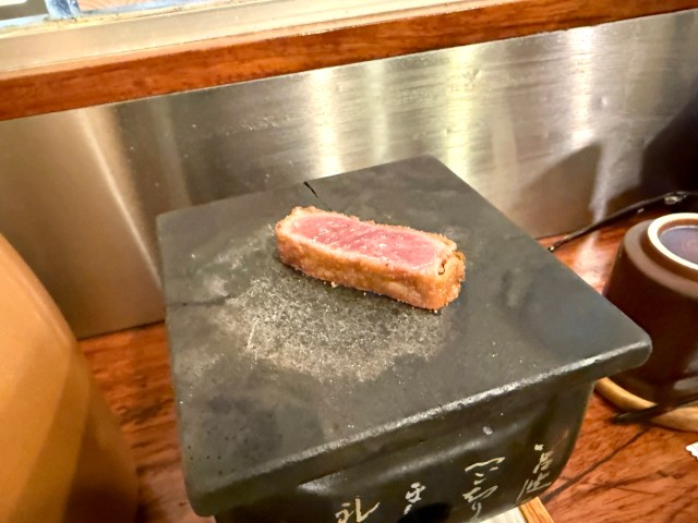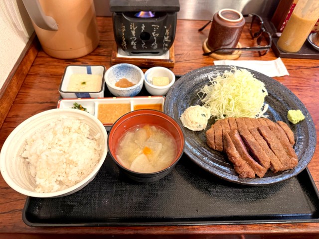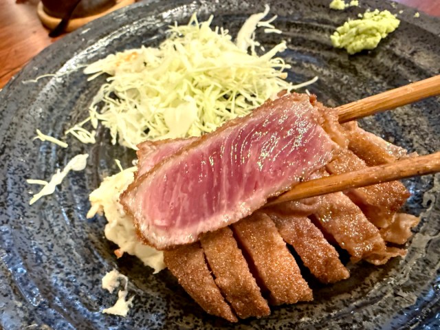 He was considerably hungry at this point and ordered the 1.5-times-bigger gyukatsu set meal for 2,555 yen ($16.50). It was a work of art and he couldn’t help but admire its visuals before digging in. The diners on either side of him were also taking lots of photos when they received their food.