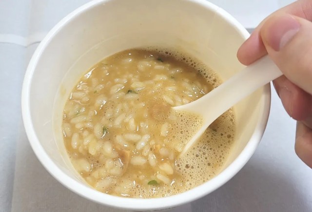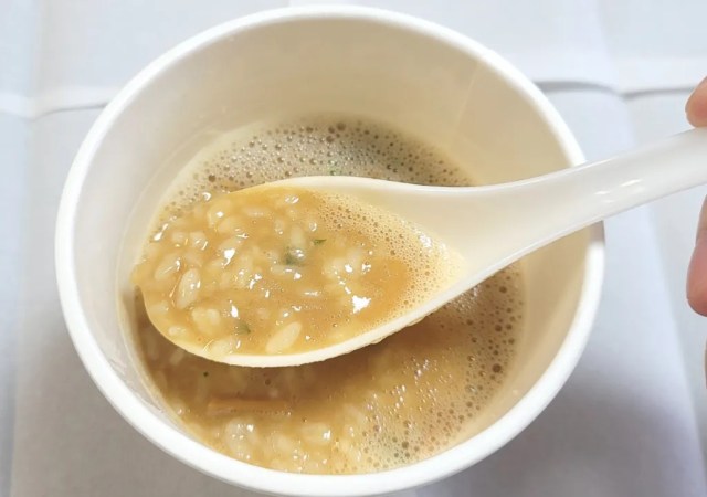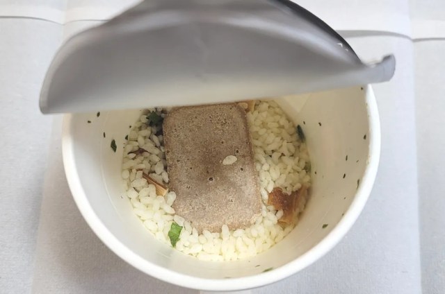 Peeling back the lid and taking a peek inside the cup, we got an eyeful of the freeze-dried rice, sliced pork, and other ingredients. The visuals aren’t too different than a yet-to-be-cooked cup of instant ramen, except for the noodles-to-rice swap, and the cooking method is similar too: just fill the cup with hot water up to the line marked on the inner surface, wait five minutes for everything to cook, and then stir everything together with chopsticks or a spoon for about 30 seconds to evenly distribute the flavor.