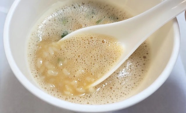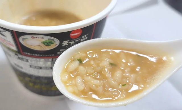 Starting with a spoonful of just the broth, our taste buds were happy to be reunited with the rich, deep Tenkaippin flavor that they know and love from the chain’s restaurants, which comes from a combination of chicken and vegetable notes. Next we tried some of the rice and found that it cooks up nice and fluffy, with no noticeable trace of dry scratchiness that we’d feared might have been there as a result of its stint in freeze-dried form.