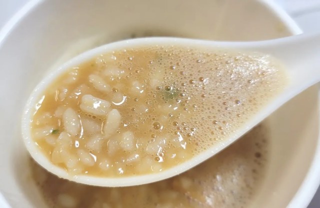 Once our five-minute wait was up we grabbed a spoon and started stirring, and right away we could see this was going to be a faithful-to-the-original Tenkaippin eating experience. The secret to Tenkaippin’s success is their signature torisayu, or chicken broth, which has a thicker consistency than other ramen restaurants’, and we didn’t even have to get up to the full 30 seconds of stirring to see that the Tenkaippin Bukkomihan Kotteri Noko Torisayu (as the Tenkaippin/Nissin collaboration is luxuriously called) is also more heartily viscous than ordinary cup ramen broth.
