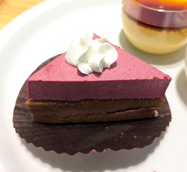 First up was chocolate and cassis cake. The top layer was cassis mousse while the bottom layer was chocolate sponge cake and cream. The delicate pairing of the sweet chocolate with the slightly acidic cassis was exquisite.