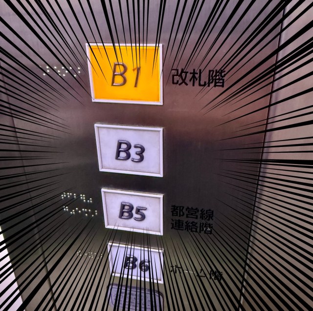 Stepping into the elevator on the B1 level, we looked at the control panel, where we saw buttons for B1, marked “改札階” (“Ticket Gate Floor”), B5 (“都営線連絡階” [“Toei Subway Connecting Floor”]) and B6 (“ホーム階” [“Platform Floor”). This was the same as the floor listing on the sign posted outside the lift when he got in, but inside, there was also an unmentioned “B3” level, which unlike the other levels, had no explanation next to it.