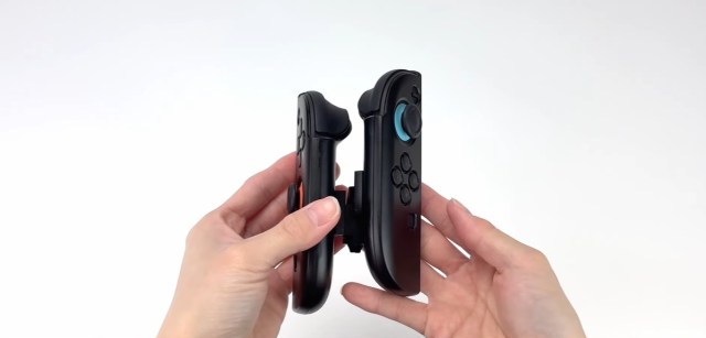 Your thumb works the analog stick of whichever Joy-Con 2 is facing you, while your middle finger, ring finger, and pinkie handle the stick and face buttons of the Joy-Con 2 on the opposite side. Your index finger does double duty, working the triggers on both Joy-Con 2s, and the Katate Grip SW2 is designed so that you can use it with either hand.