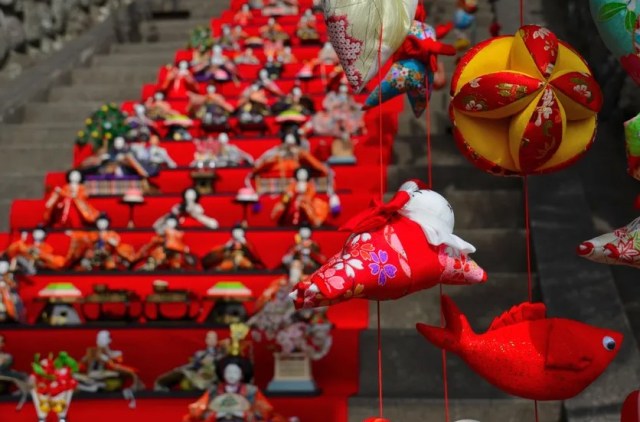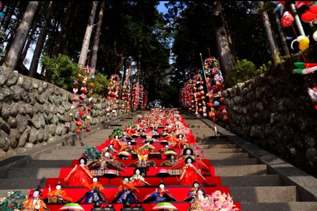 In anticipation of Hina Matsuri on March 3, Susanoo Shrine, which is part of the Inatori Onsen hot springs resort in Higashiizu, Shizuoka Prefecture, is currently hosting its own Hina Tsurushi Kazari Festival from January 20 through March 31. Tsurushi kazari are a traditional craft local to the area in the form of hanging displays of handsewn hina decorations made from repurposed scraps of quality fabric and hung from common threads. For the shorter duration of February 14 through March 8, the shrine will feature a breathtaking display of hina dolls spilling down the stone steps to the shrine’s entrance, flanked by these gorgeous hanging decorations.