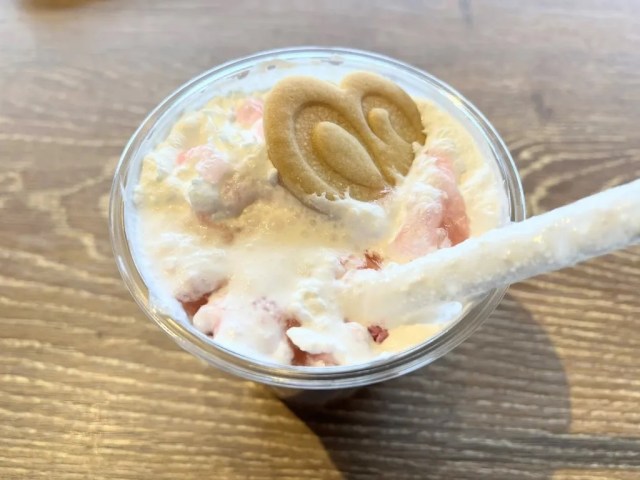 So we’re already off to a very cherry blossom-y start, and that theme doesn’t change once you get underneath the toppings. Inside the cup is sakura-flavored milk, sakura an (sweet bean paste), and more sakura sauce. Sakura flavor is sweet with salty notes and just a touch of an herbal sensation, and while some cherry blossom desserts are too light or too heavy with it, here it feels just right, especially when you get to the pieces of soft, jiggly mochi (warabimochi) that are mixed in. The cookie that comes on top is great too. While it’s a simple butter cookie in and of itself, letting it soak in the drink for a bit so that it absorbs the sakura flavor turns it into a delicious morsel that adds some variety to the texture too.
