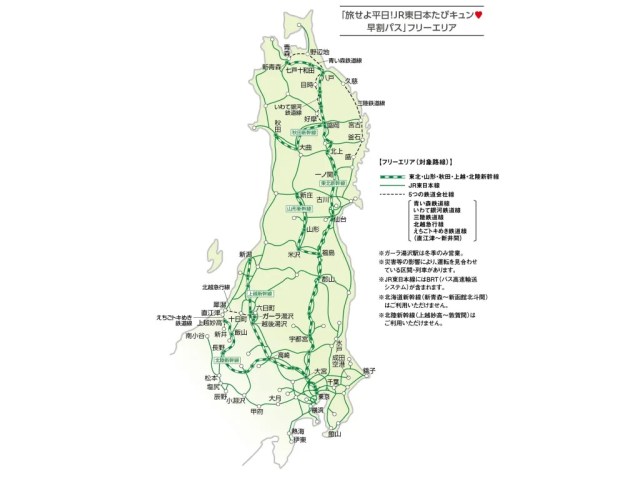East Japan Railway Company/JR East is currently offering a one or two-day unlimited train ride pass called the Kyun Pass. The pass can be used on all JR East lines, which stretch from Tokyo all the way up to the tip of the northeastern Tohoku region and also to parts of the Chubu region that include Niigata, and yes, it can be used on the Shinkansen too. In addition, the Kyun Pass gets you unlimited rides on five affiliated lines, the Aomori Railway Line, Iwate Galaxy Railway Line, Sanriku Railway Line, Hokuetsu Express Line, and Echigo Tokimeki Railway Line, and even BRT buses on the Kesennuma and Ofunato Lines.