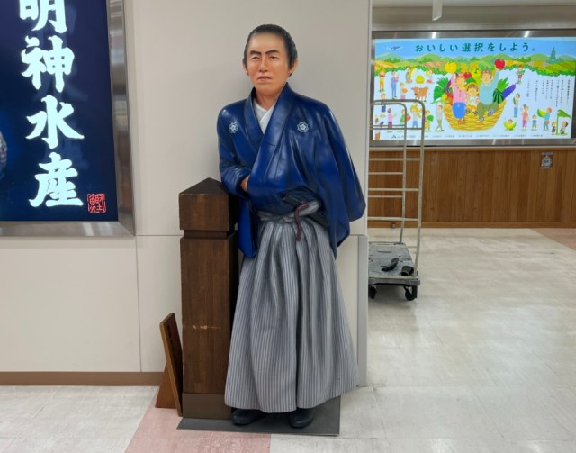 There are multiple Ryoma photo spots inside the building too. The first one we came across was this recreation of the Ryoma statue that stands on Kochi’s Katsurahama Beach, complete with a stylized version of the seashore’s crashing waves.