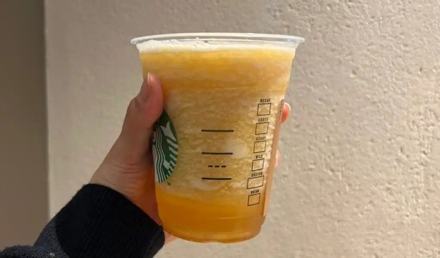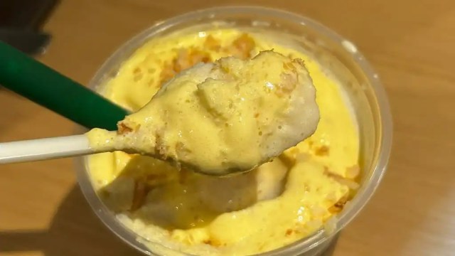 This is a cream-based Frappuccino, with a blended vanilla, milk, and caramel base that evokes all of the happy memories of reaching the filling of a cream puff. It’s topped with a swirl of custard-flavored whipped cream made with vanilla and egg yolk, the latter of which helps give it an especially eye-catching canary color. Of course, there’s more to cream puffs than just the cream part, and so Starbucks also sprinkles on bits of crunchy cream puff pastry, and there’s a layer of them at the bottom of the cup too, waiting for you to either sip your way down to them or stir them up into the rest of the drink.