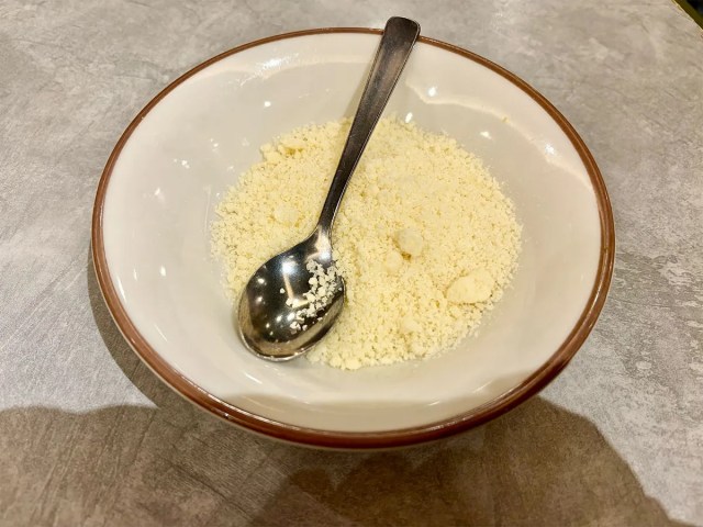 Honestly, Asami had wanted to try out the Bismarck-style Pizza, but dining alone on this occasion, it was far beyond her stomach’s capacity to withstand, so she went for the Grated Cheese Topping (100 yen) instead.