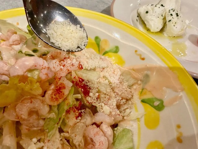 ▼ Her first recommendations for the perfect date spread are Shrimp Salad (350 yen)…