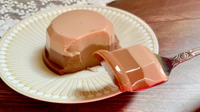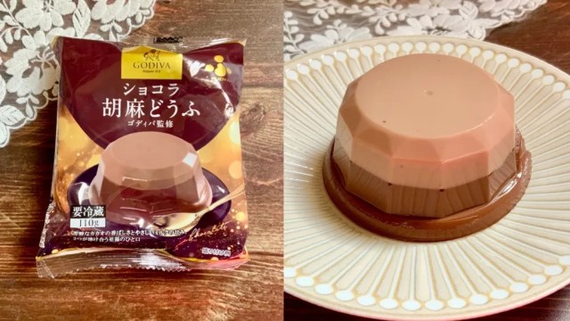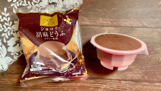 Both of them are types of gomadofu, or sesame tofu, and first up on our taste test list is Godiva’s standard Chocolat Gomadofu. The tofu comes packaged in its own little cup, like an individual-serving pudding, but we decided to get fancy and plate it.