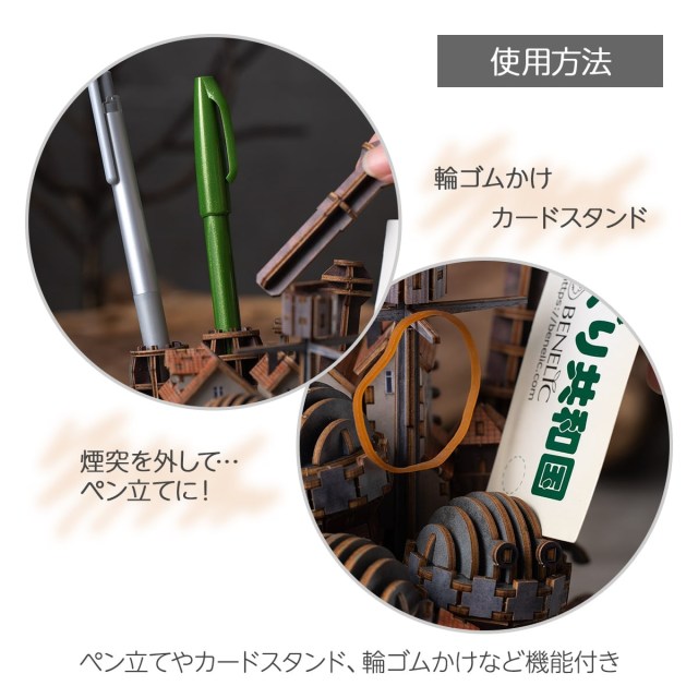 Now available through Ghibli specialty shop Donguri Kyowakoku, this wooden reconstruction of the marque stronghold stands 15 centimeters (5.9 inches) tall…once you put it together. The assembly process apparently isn’t as simple and uneventful as putting together a simple model, either, as the designers say it’s a 3-D puzzle, and designate it with a five-out-of-five rating in terms of difficulty.