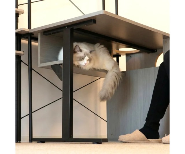 The section of the desk is also connected to the wider top-tier section on its right edge, allowing your cat to easily move from one to the other, or in or out of the desk entirely, without having to go under the desk itself.