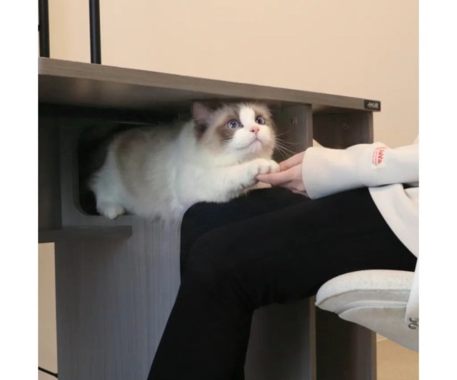 Unfortunately, no amount of attempted explaining will convey to your cat how it’s in their best interest too to let you work efficiently, so that you can earn the money that pays for their treats, toys, and other essentials. So instead, Japanese furniture and homewares company Bibilab has developed a compromise: the Neko House Desk.